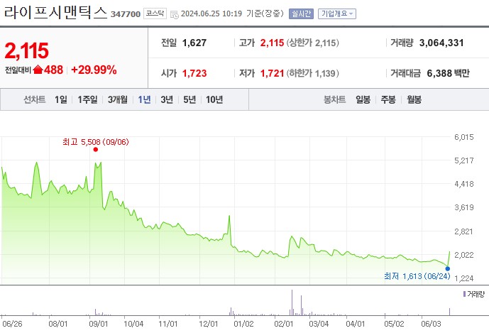라이프시맨틱스 주가는 2023년 6월 24일 최저 1,613원, 2023년 9월 6일 최고 5,508원을 기록하였습니다.