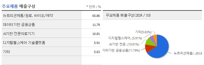 주력 제품인 뉴트리션 제품과 바이오/제약 제품은 전체 매출의 65.86%를 차지하고 있으며, 데이터 기반 금융상품은 11.79%, AI 기반 전문 의료기기는 10.81%, 디지털 헬스케어 기술 플랫폼은 5.91%를 차지하고 있습니다.