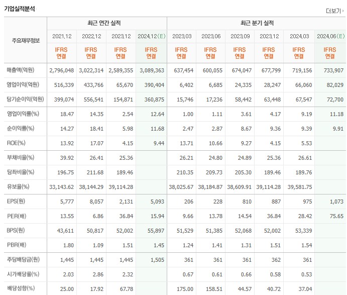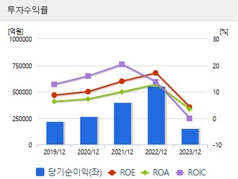 2023년 ROE가 크게 감소한 이유는 당기순이익의 급격한 감소 때문으로 보입니다. 그러나 전반적으로 삼성전자는 안정적인 재무 상태를 유지하고 있습니다.