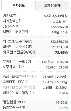 외국인 소진율은 약 75.48%로, 외국인 투자자들에게도 큰 인기를 끌고 있습니다. 액면가는 100원이며, 현재 주가는 약 63,500원에 거래되고 있습니다.