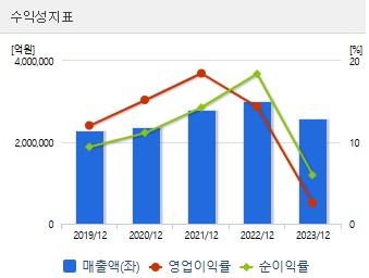 당기순이익 역시 2021년 39조 9,074억 원, 2022년 55조 6,541억 원, 2023년 15조 4,871억 원으로 나타났습니다. 이는 글로벌 경기 둔화와 반도체 수요 감소 등의 외부 요인이 영향을 미친 것으로 보입니다.