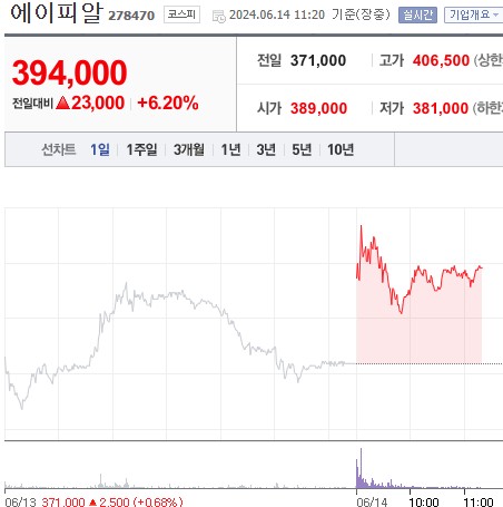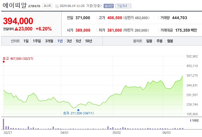 에이피알은 2024년 2월 공모가 250,000원으로 상장하였습니다. 상장 초기부터 큰 관심을 받으며 주가는 467,500원까지 급등했으며, 오늘까지 394,000원으로 크게 상승하였습니다.