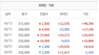 장 초반에 40만원을 뚫더니 소폭 하락하여 394,000원 정도에 거래되고 있습니다. 전일 종가 대비 무려 6.2%나 상승한 채 말입니다.