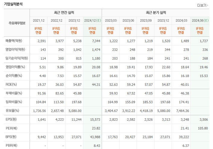 2021년 매출액은 2,591억 원이었으나, 2023년에는 5,238억 원으로 증가하였고, 2024년 예상 매출액은 7,344억 원입니다. 영업이익도 2021년 143억 원에서 2023년 1,042억 원, 2024년 예상 1,474억 원으로 급증하였습니다.