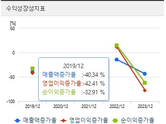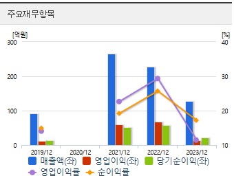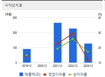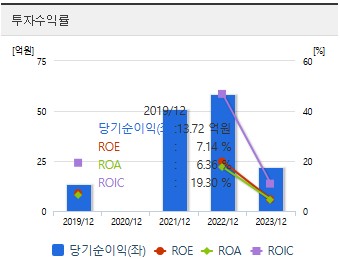 당기순이익: 2021년 51억 원, 2022년 59억 원, 2023년 22억 원
