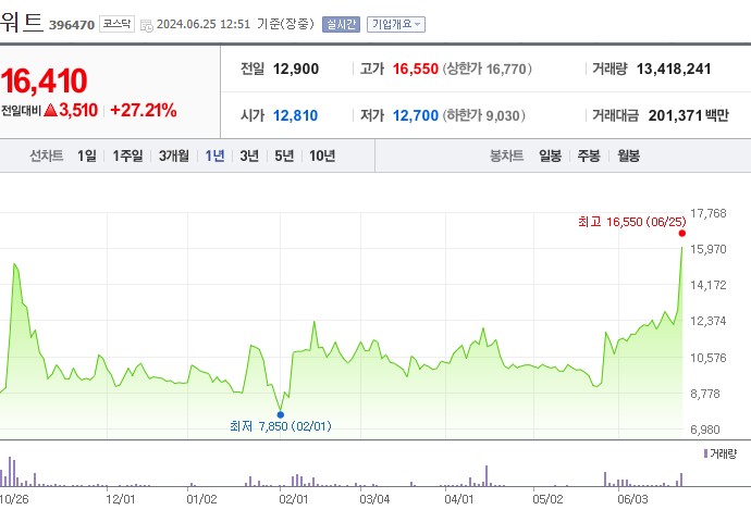 워트 주가는 2024년 6월 25일 최고 16,550원을 기록했으며, 2024년 2월 1일 최저 7,850원을 기록했습니다. 주가는 전반적으로 상승 추세를 보이고 있으며, 특히 최근 큰 폭의 상승을 기록하였습니다. 높은 관심을 반영하는 것으로 보입니다.
