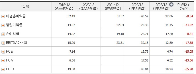 ROE는 2021년 19.79%, 2022년 19.79%, 2023년 4.74%로, 수익성이 다소 감소하는 추세를 보이고 있습니다. 부채비율은 2021년 16.97%, 2022년 8.93%, 2023년 2.52%로 낮은 수준을 유지하고 있어 재무 건전성이 양호합니다.
