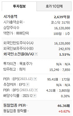 시가총액은 약 2,639억 원이며, 코스닥 시장에서 317위에 위치해 있습니다. 외국인 소진율은 1.51%로, 비교적 낮은 수준을 유지하고 있습니다. 투자기관의 목표 주가는 제공되지 않았으나, 52주 최고가는 16,550원(2024년 6월 25일), 최저가는 7,850원(2024년 2월 1일)입니다. 현재 주가는 16,410원으로 전일 대비 27.21% 상승한 상태입니다.