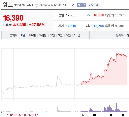 상한가에 근접한 기업이 있으니 워트! 장 초반부터 상승 기조를 보이다가 오전 11시부터 거래량이 터지며 27%가까이 급등하며 놀라운 시세를 보여주고 있습니다.