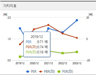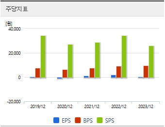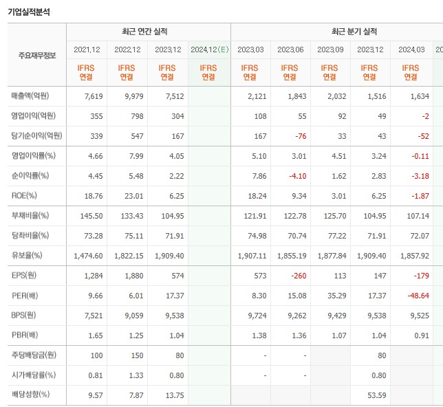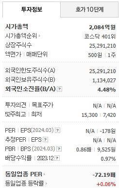 52주 최고가는 15,300원, 최저가는 7,420원으로 기록되었습니다. 2023년 12월 기준 PER은 -72.19배, PBR은 0.86배입니다. 배당수익률은 0.97%로 나타나고 있습니다.