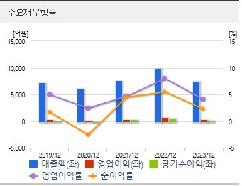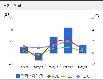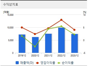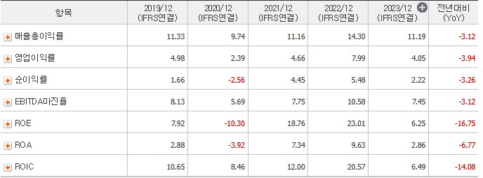 영업이익률은 2021년 4.66%, 2022년 7.99%, 2023년 4.05%로 나타났습니다. 순이익률 역시 2021년 4.45%, 2022년 5.48%, 2023년 2.22%로 감소했습니다. ROE는 2021년 18.76%, 2022년 23.01%, 2023년 8.44%로 하락했습니다.