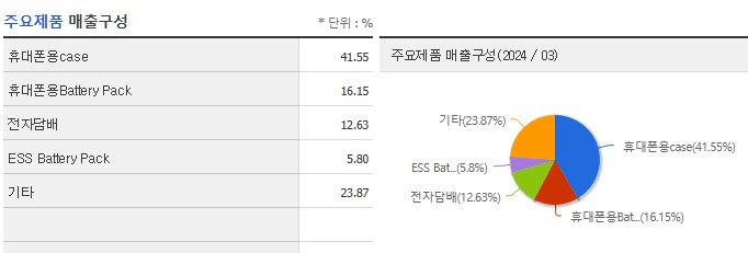 매출 구성은 다음과 같습니다. 휴대폰용 케이스가 41.55%로 가장 큰 비중을 차지하고 있으며, 휴대폰용 배터리 팩이 16.15%, 전자담배가 12.63%, ESS 배터리 팩이 5.80%, 기타가 23.87%를 차지하고 있습니다. 주요 매출원은 휴대폰용 부품으로, 전체 매출의 절반 이상을 차지하고 있습니다.