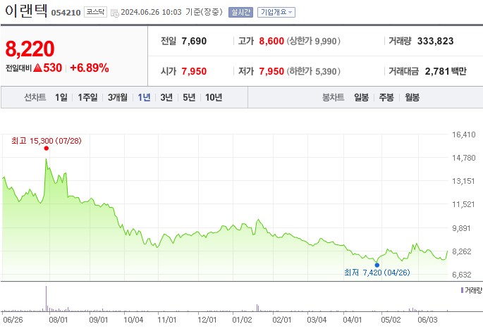 이랜텍 주가는 지난 1년간 큰 변동을 보였습니다. 최고가는 2023년 7월 15,300원, 최저가는 2024년 4월 7,420원으로 기록되었습니다. 현재 주가는 8,220원으로 전일 대비 6.89% 상승하였습니다.