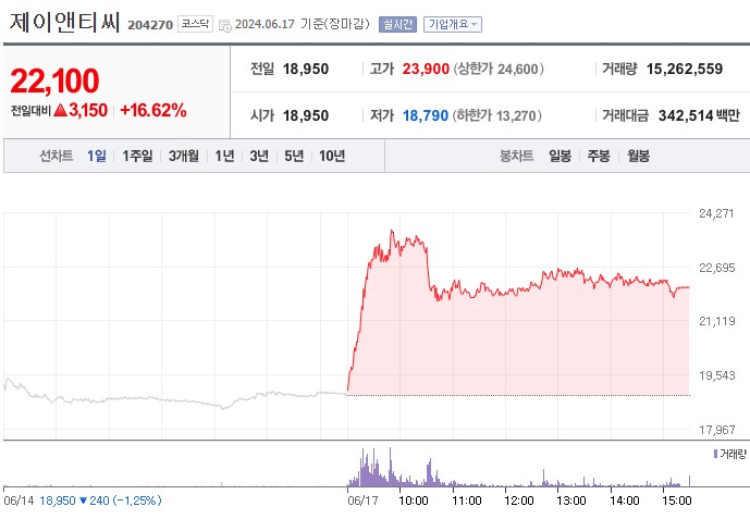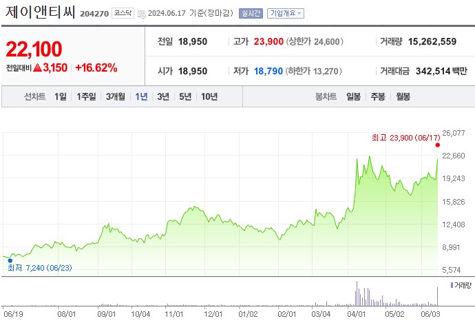 2024년 6월 17일 기준으로 제이앤티씨의 주가는 22,100원으로 전일 대비 3,150원(16.62%) 상승하였습니다. 이는 최근 주가가 큰 폭으로 상승하고 있음을 보여줍니다. 1년간 주가 흐름을 보면, 최저 7,240원에서 최고 23,900원을 기록하며 강한 상승세를 보이고 있습니다.