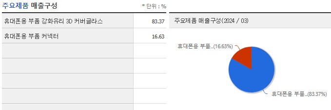 제이앤티씨의 주요 제품 매출구성을 보면, 휴대폰용 부품 강화유리 3D 커버글라스가 전체 매출의 83.37%를 차지하고 있으며, 휴대폰용 부품 커넥터가 16.63%를 차지하고 있습니다.