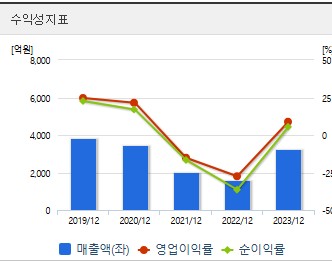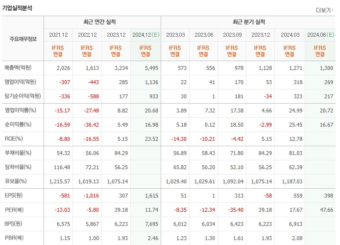 영업이익은 2021년 -307억 원에서 2022년 -443억 원으로 적자를 기록하였으나, 2023년에는 285억 원의 흑자를 기록하며 회복세를 보였습니다. 2024년에는 1,136억 원으로 예상됩니다.