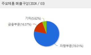 현대차 주요 제품 매출 구성을 살펴보면 차량 부문이 78.01%를 차지하고 있으며, 금융 부문이 16.37%, 기타가 5.62%를 차지하고 있습니다.