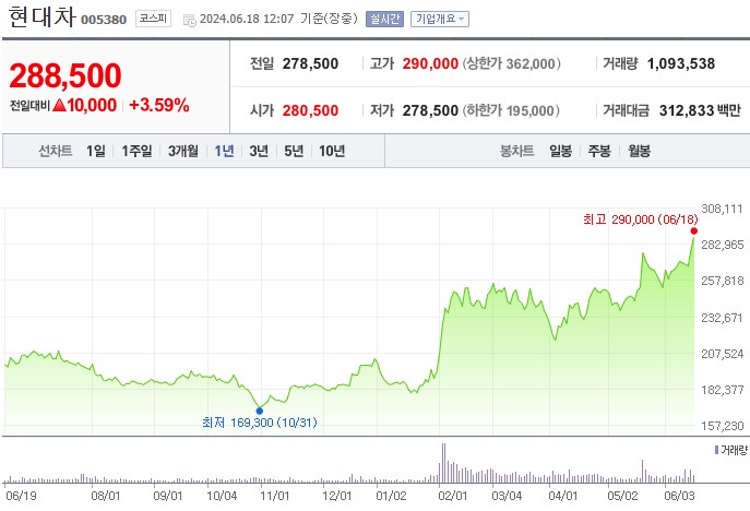 현대차 주가 차트를 보면, 1년간 최저가는 2023년 10월 31일의 169,300원이었으며, 최고가는 2024년 6월 18일의 290,000원입니다. 최근 1년간 주가는 지속적인 상승세를 보이고 있으며, 특히 2024년 6월 들어 급격한 상승세를 기록했습니다.
