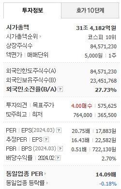 포스코홀딩스는 코스피에 상장된 기업으로, 현재 시가총액은 약 31조 4,182억 원으로 코스피 10위에 위치하고 있습니다. 외국인 소진율은 약 27.73%로, 외국인 투자자들도 많은 관심을 보이고 있습니다.
