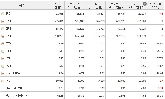 2022년: 2022년에는 주당 배당금으로 총 17,000원을 지급하여 전년 대비 증가한 배당금을 지급했습니다.