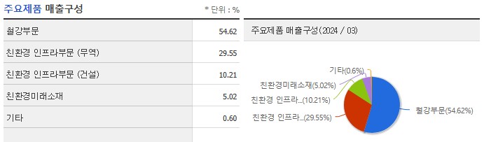이 기업의 주요 매출 구성은 철강 부문이 54.62%, 친환경 인프라 부문(무역)이 29.55%, 친환경 인프라 부문(건설)이 10.21%, 친환경 미래 소재가 5.02%를 차지하고 있습니다. 이는 철강 산업 외에도 다양한 사업 부문에서 매출을 창출하고 있음을 보여줍니다.