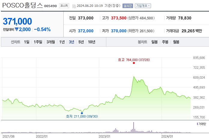 포스코홀딩스 주가 최근 1년간 흐름을 보면, 2023년 9월 30일 최저 211,000원에서 2023년 7월 28일 최고 764,000원을 기록한 후 현재 371,000원에 거래되고 있습니다.