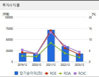 부채비율은 2021년 66.90%, 2022년 92.61%, 2023년 118.25%로 다소 높은 수준을 보이고 있습니다. 이는 최근 투자와 확장에 따른 부채 증가로 해석할 수 있습니다. ROE(자기자본이익률)는 2021년 13.97%, 2022년 6.31%, 2023년 3.18%로 나타났습니다. 2023년 ROE가 크게 감소한 이유는 당기순이익의 급격한 감소 때문으로 보입니다. 전반적으로 포스코홀딩스는 안정적인 재무 상태를 유지하고 있지만, 부채 관리가 중요한 과제로 남아 있습니다.