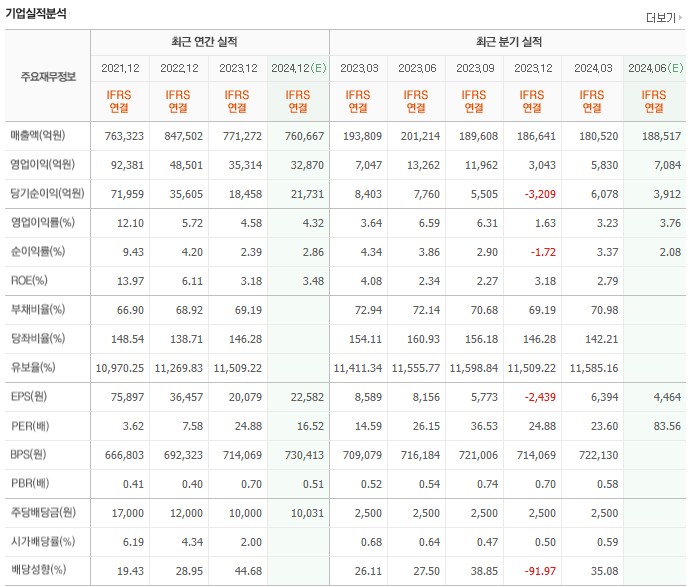 최근 3년간 매출액은 2021년 76조 3,323억 원, 2022년 84조 7,502억 원, 2023년 77조 1,272억 원으로 꾸준히 유지되고 있습니다. 2024년 예상 매출액은 약 76조 660억 원으로 전망되고 있습니다. 이러한 매출 흐름은 포스코홀딩스의 다양한 사업 부문에서의 안정적인 성과 덕분입니다.